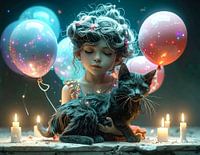 Een mooi meisje, met neon gekleurde ballonnen en haar zwarte kat, zit met haar ogen dicht te dromen. Zij heeft een jurk aan met gouden en gekleurde edelstenen, net een prinses. Het beeld is met behulp van ai gegenereerd.