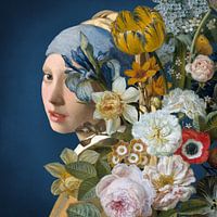 In deze versie, die ik digitaal vervaardigd heb in 2023, staat het meisje half verscholen achter bloemen uit een stilleven van de Nederlandse kunstschilder Eelke Jelles Eelkema (1788 - 1839).
