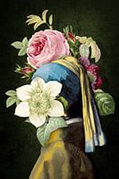 In deze versie uit 2022, een collage, is ze verstopt achter prachtige bloemen, maar is en blijft ze nog altijd herkenbaar. Ze is afgebeeld voor een achtergrond van groen damask.