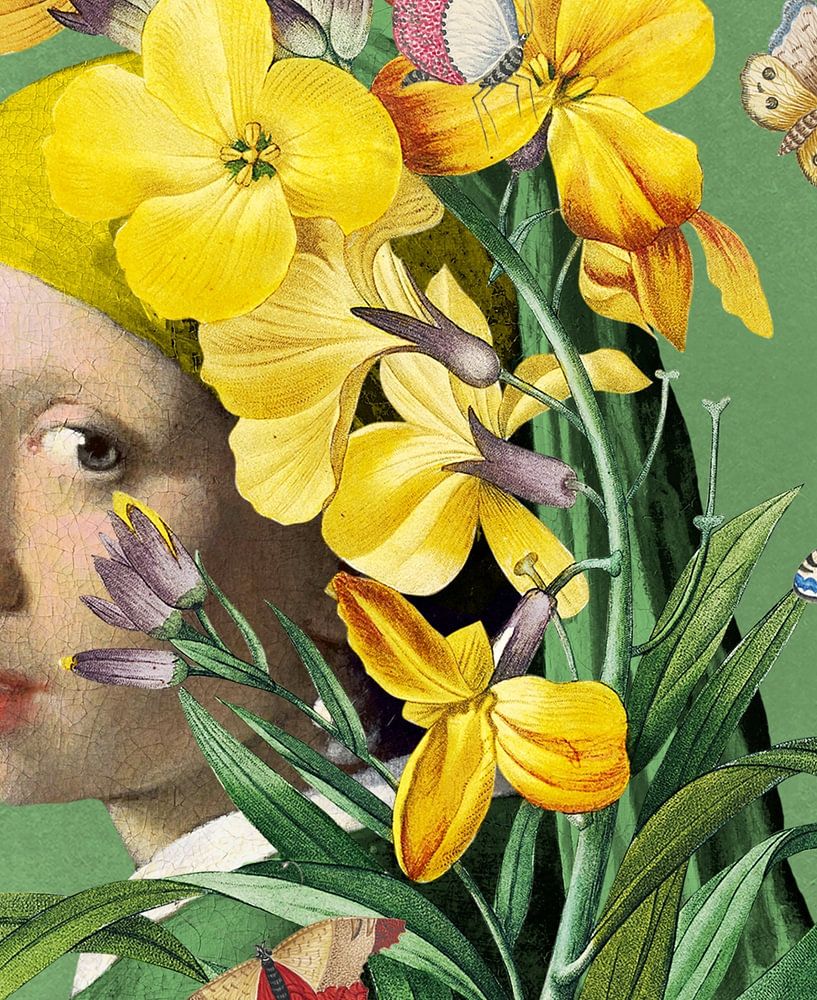 Collage met vintage, botanische afbeeldingen van een prachtige gele plant, van vlinders en van het door de Nederlandse kunstschilder Johannes Vermeer in 1665-1667 geschilderde "Meisje met de parel".