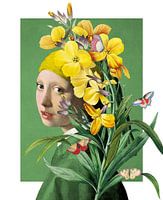 Collage met vintage, botanische afbeeldingen van een prachtige gele plant, van vlinders en van het door de Nederlandse kunstschilder Johannes Vermeer in 1665-1667 geschilderde "Meisje met de parel".