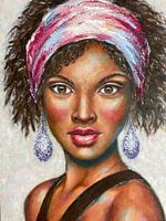 Vrolijk portret van jonge vrouw in warme kleuren. De kleurrijke bandana en oorbellen geven een extra accent aan dit portret. Het schilderij is met acrylverf geschilderd (combinatie van kwast en paletmes). Woonstijl bohemian.