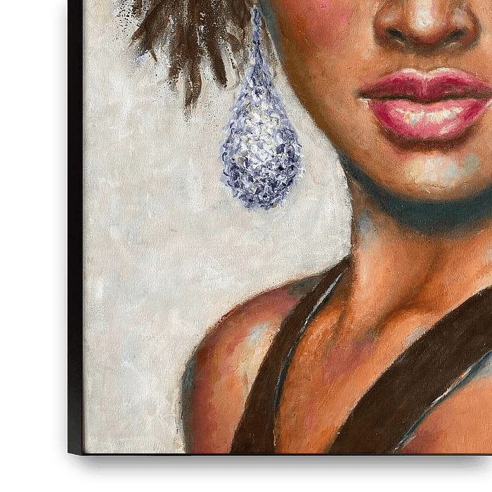 Vrolijk portret van jonge vrouw in warme kleuren. De kleurrijke bandana en oorbellen geven een extra accent aan dit portret. Het schilderij is met acrylverf geschilderd (combinatie van kwast en paletmes). Woonstijl bohemian.