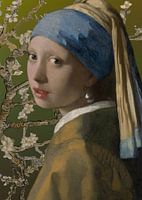 Het Meisje met de parel van Johannes Vermeer is samengevoegd met de Amandelbloesem van Vincent van Gogh. De achtergrond van de amandelbloesem is aangepast en veelkleurig gemaakt. Kunst met een knipoog!