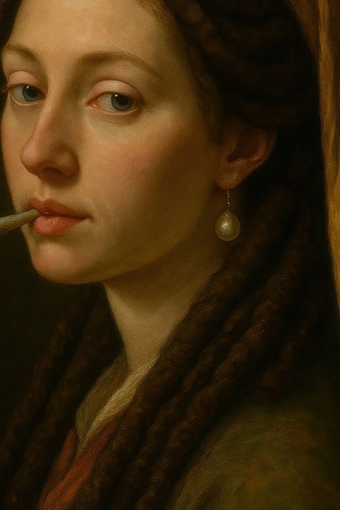 Een mysterieus wezen met dreadlocks en een verleidelijke uitdrukking boeit de kijker. De zachte rook en de karakteristieke parel geven het beeld een tijdloze elegantie. Ideaal voor een woonkamer, waar het een gesprek kan stimuleren en de verbeelding kan prikkelen terwijl het een sfeer van kunst en stijl creëert.