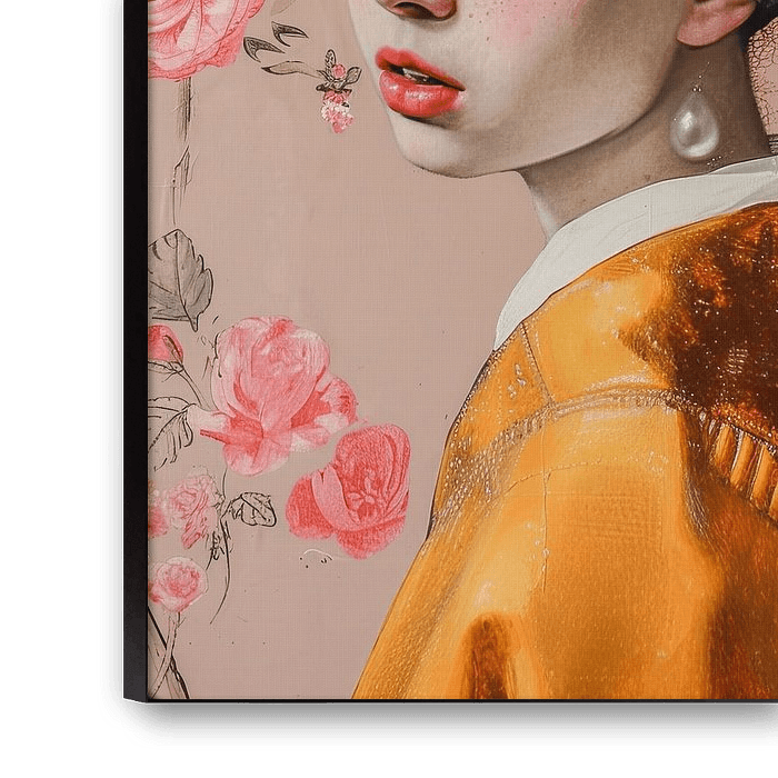 De achtergrond bevat elementen van bloesem en bloemen in roze, crème en rode tinten, wat een contrast vormt met de meer aardse kleuren van het meisje's kleding en hoofddoek. De hoofddoek van het meisje is opvallend, met oranje en witte patronen die een gevoel van warmte en textuur geven. Haar huid lijkt bijna doorschijnend met sproeten en een natuurlijke blos, wat een levensechte kwaliteit aan het beeld geeft. De parel in haar oor blijft een centraal punt en vangt het licht, wat bijdraagt aan de diepte van het portret.