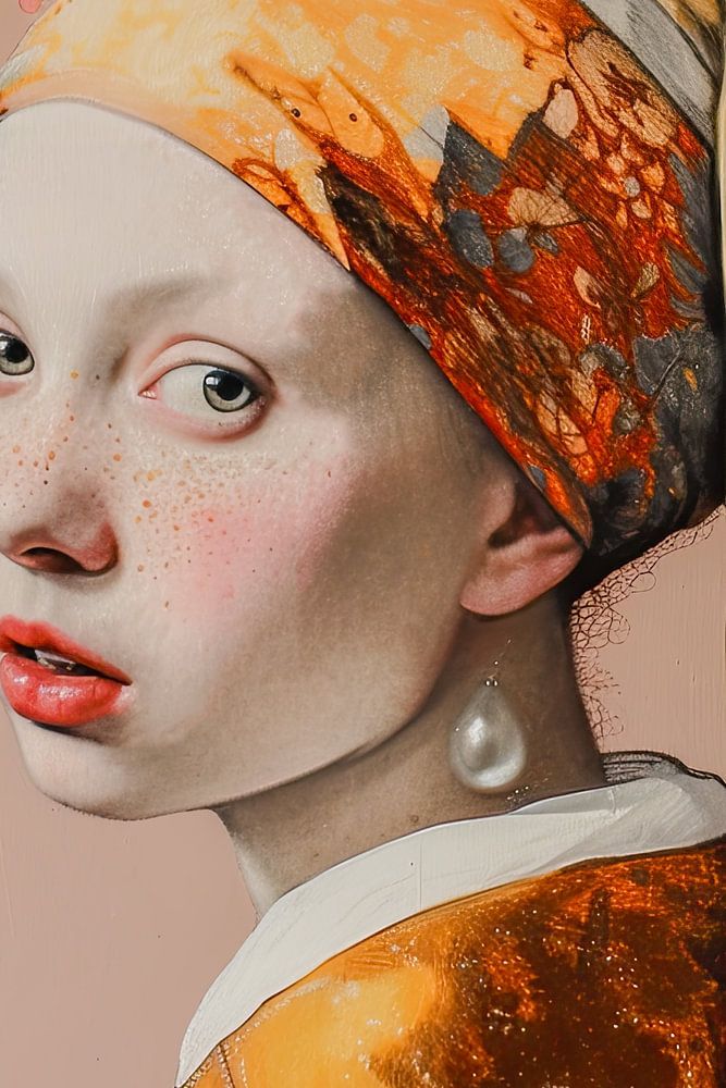 De afbeelding is een bewerkte versie van het beroemde schilderij "Meisje met de parel" van Johannes Vermeer, waarbij het kleurenpalet is aangepast naar warmere tinten.
