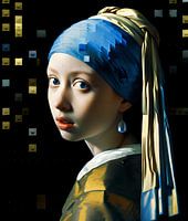 Het bekende portret van het 'Meisje met de parel' met een moderne twist. Een kleurrijk geheel.