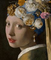 Alsof ze in de huidige tijd leeft, heeft het meisje met de parel een make over laten doen. Ze heeft bruine contactlenzen ingedaan (staan haar goed). Bovendien heeft ze haar parel ingeruild voor een modieuzer model. Ze heeft haar rode lippen iets dikker aangezet. Alsof het nog niet genoeg was heeft ze haar hoofddoek met bloemen gesierd. Als Johannes Vermeer dit allemaal zou hebben geweten! Deze kanjer is in deze uitvoering uniek en past in ieder modern interieur.