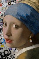 Tijdens haar bezoek aan het Rijksmuseum in Amsterdam, waar het meisje met de parel het stralende middelpunt was, is ze er even tussenuit gepiept en heeft een nieuwe oorbel en neusring aangeschaft. Ze poseert er mee voor een met graffiti behangen Amsterdamse muur. Kunst met een knipoog!