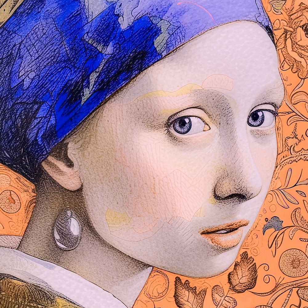 Deze afbeelding toont een bewerking van "Meisje met de parel" van Johannes Vermeer. Het meest opvallende aspect is de levendige peach fuzz gekleurde achtergrond, rijkelijk versierd met gedetailleerde bloemen en botanische motieven die een opvallend contrast vormen met het onderwerp. Het meisje zelf is vrij getrouw weergegeven met zachte huidtinten en subtiele blosjes op haar wangen, die de jeugdigheid en onschuld van haar uitdrukking versterken. Haar tulband is een mix van realistisch weergegeven blauwe en gele stoffen, wat een textuur geeft die bijna tastbaar lijkt. De parel in haar oor, een sleutelkenmerk van het originele schilderij, is subtiel maar duidelijk aanwezig. Dit kunstwerk brengt een klassiek portret samen met een moderne, kleurrijke en patroonrijke achtergrond, wat resulteert in een boeiende fusie van oud en nieuw.