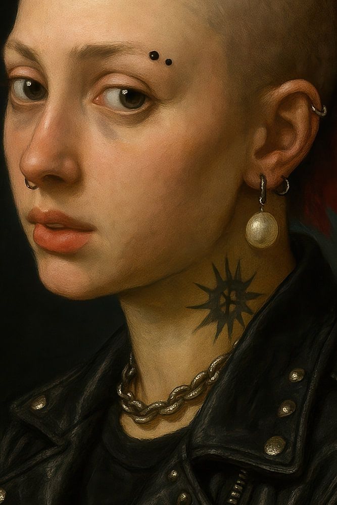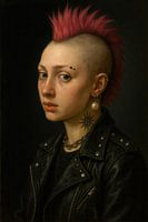 In een fascinerende mix van traditie en moderniteit straalt de hoofdpersoon een rebelse elegantie uit met haar opvallende, roze mohawkkapsel en stralende parel. De diepe ogen en het zwaar getatoeëerde decolleté vertellen verhalen van individualiteit en moed. Dit stuk zou perfect passen in een creatieve woonkamer die persoonlijke expressiviteit en kunstmatigheid combineert.