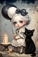 Een schattige pop, met haar zwarte kat, ballonnen en een taart met kaarsjes, viert haar verjaardag. Haar kleding ziet er retro uit en waant je terug in de tijd. De achtergrond is als een olieverfschilderij en bijna alles is zwart-wit, zelfs de ballonnen, een zwarte en een witte ballon. Een subtiel kleurtje van het meisje en de kaarsjes maakt het levendiger. Het beeld is met behulp van ai gegenereerd.