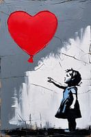 Dit indrukwekkende kunstwerk in street art-stijl toont een jong meisje dat reikend een hartvormige ballon loslaat. De kracht van dit beeld ligt in zijn eenvoud en sterke contrasten, waardoor het emoties van loslaten en hoop oproept. De rode ballon tegen de sobere achtergrond trekt onmiddellijk de aandacht, terwijl het silhouet van het meisje een verhaal vertelt zonder woorden. Dit kunstwerk is een mooie aanvulling in moderne interieurs, waar het niet alleen als eyecatcher fungeert, maar ook dieperliggende emoties aanspreekt. Perfect voor liefhebbers van urban art en mensen die op zoek zijn naar kunst met een boodschap.