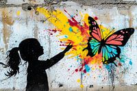 Deze unieke street art muurschildering combineert een silhouet van een meisje dat reikt naar een kleurrijke vlinder. Het ontwerp springt eruit door de explosieve kleuren en dynamische compositie. Perfect als decoratief stuk dat elke ruimte opfleurt en een verhaal vertelt over vrijheid en verbeeldingskracht.