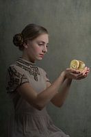 Portret van een meisje met kuiken. Het licht val mooi op het kuikentje zodat dit alle aandacht krijgt, zowel van het meisje op de foto als van de kijker