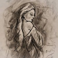 Een meisje met linnen doeken - getekend met houtskool op papier - bewerkt met photoshop. Eenvoudig portret in een rustige stijl.