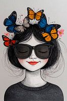 Een illustratie van een meisje met donker haar, een donkere zonnebril op en met kleurrijke vlinders en kleine roze bloemetjes in en rond haar haar. Haar rode lippen glimlachen, haar ogen zijn gesloten en zij heeft roze blosjes op haar wangen, een zachte dromerige uitstraling. Het beeld is met behulp van ai gegenereerd.