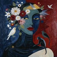 Het schilderij Meisje met vogel en aap is een intieme verkenning van de complexe relatie tussen mens en natuur, waarin ik emotie en symboliek verweef om een verhaal te vertellen dat woorden te boven gaat. Het meisje in het midden lijkt in harmonie met de vogel en de aap, maar haar blik draagt een zweem van melancholie in zich, een subtiele uitnodiging om naar binnen te kijken - naar haar eigen verhalen, naar de verbindingen die we koesteren of verliezen.