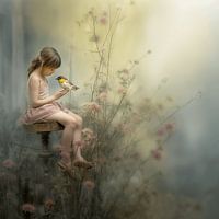 Laat je betoveren door de dromerige schoonheid van dit kunstwerk, waar een meisje wordt omarmd door een sereen landschap geschilderd in de zachte tinten van pastelkleuren. De aquarel stijl voegt een vleugje zachtheid en subtiliteit toe aan het tafereel, terwijl het landschap zich uitstrekt in een betoverende vertoning van rust en sereniteit. Het meisje, omgeven door de tere kleuren van haar omgeving, straalt een gevoel van lieflijke onschuld uit, waardoor een sfeer van kalmte en vrede ontstaat. Dit kunstwerk neemt je mee op een reis naar een wereld van dromen en verbeelding, waar de grens tussen werkelijkheid en fantasie vervaagt.