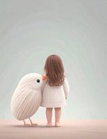 Een schattig lief klein meisje op blote voetjes, met achter haar een wollig lief vogeltje dat haar aandacht probeert te trekken. Het meisje heeft een wollen jurkje aan en de vogel is van wol gemaakt. Het ziet er schattig, zacht en aaibaar uit. Het beeld is met behulp van ai gegenereerd.
