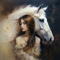 Meisje met wit paard met een dromerige uitstraling. Een prachtig werk voor aan je muur. Voor de echte paardenliefhebbers!