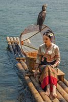 Chinees meisje op een vlot met aalscholvers op de Li-rivier bij Yangshuo. Ze draagt een van de vele klederdrachten van China. In de ochtend vissen de vissers met deze bootjes op de Li rivier.
