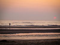 Een jonge vrouw bekijkt het ondergaan van de zon op het strand van Camperduin in Noord Holland.