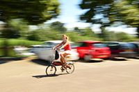Mijn vrouw neemt altijd haar vouwfiets mee naar haar werk om parkeergeld te vermijden. Dit is haar fiets in onze straat in Huizen, Nederland. Ik vond het gevoel van beweging prachtig. Ik vond de titel Office girl in dit geval toepasselijk.