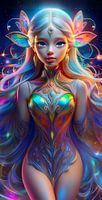 Een prachtig meisje, ziet er uit als een engel, straalt licht uit in allerlei kleuren. Zij lijkt te zweven in het universum en straalt alleen maar een positieve sfeer uit. Het beeld is met behulp van ai gegenereerd.