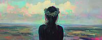 Meisje - Zicht. Panorama uitzicht meisje met bloemen. Impressionisme portret schilderij van vrouw bij een uitzicht op een landschap.