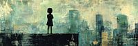 Meisjestad | Meisje Stadssilhouet - Dit abstracte stadsgezicht schilderij toont een silhouet van een jong meisje dat uitkijkt over een fantasierijke stedelijke skyline, geschilderd met brede, expressieve penseelstreken en een overheersend blauw-groen kleurenpalet.