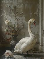 Serene en enigszins melancholische scène uit, waarin een elegante zwaan centraal staat in een verouderde, bijna vervallen omgeving. De zwaan, met zijn sierlijke nek en witte verenkleed, straalt rust en gratie uit. Het contrast tussen de pure, witte zwaan en de verweerde achtergrond versterkt de schoonheid en kwetsbaarheid van het dier.