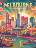 Vier kosmopolitisch Australië met deze kleurrijke reisposter van Melbourne, met de indrukwekkende skyline van de stad bij zonsopgang en een levendige weerspiegeling op de Yarra River. Historische kerken, moderne wolkenkrabbers en levendige boten creëren een gelaagd stedelijk tafereel tegen een stralende hemel vol stralen en zwevende vogels. Deze retro-geïnspireerde print is de perfecte manier om de culturele rijkdom, architectonische hoogstandjes en ontspannen levensstijl van Melbourne in elke woonruimte, kantoor of studio te brengen. Zowel de lokale bevolking als reizigers zullen dol zijn op de mix van stadselegantie en hedendaagse designflair, die de diversiteit en sfeer benadrukt die Melbourne tot een wereldwijde topbestemming maken. De afbeelding vangt de essentie van de artistieke geest, bruisende straten en iconische rivieroevers en nodigt kijkers uit om de avonturen in de dynamische metropool van Australië te verkennen of zich te herinneren. Voeg een vleugje zonneschijn en stedelijke charme toe aan je inrichting met een reiskunstwerk dat de allure van Melbourne viert als zowel een creatieve hoofdstad als een bruisend stadslandschap.