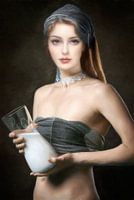 Het Melkmeisje van Johannes Vermeer in een modernere versie. Mixed media schilderij op canvas.