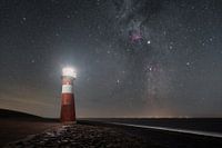 De zwaan regio van de melkweg boven vuurtoren Noorderhoofd in Westkapelle, Zeeland, Nederland.