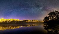 De prachtige mwelkwegboog boven het duinmeertje van West-Terschelling Doodemanskisten met prachtige reflectie. De bomen worden verlicht door de Brandaris en boven de bomen zie je een gloed van het Noorderlicht!