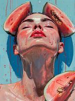 Expressief kleurrijk portret van een vrouw met water meloenen genietend van de zon.