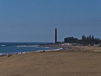 Uitzicht over het beroemde zandstrand van Meloneras met de vuurtoren Faro de Maspalomas aan de zuidkust van het eiland Gran Canaria, Canarische Eilanden, Spanje in de Atlantische Oceaan op een zonnige dag in het hoogseizoen in de winter.