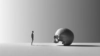 Deze monochrome illustratie toont een kleine menselijke figuur in profiel die naar een schedel kijkt in een surrealistische minimalistische illustratie. De strakke lijnen en het gereduceerde kleurenpalet benadrukken de minimalistische esthetiek en versterken de surrealiteit van de scène. De menselijke figuur die naar de schedel kijkt symboliseert de menselijke reflectie op vergankelijkheid en dood, terwijl de schedel zelf het concept van memento mori belichaamt - de herinnering aan de eindigheid van het leven. De eenvoudige afbeelding nodigt de kijker uit om na te denken over existentiële thema's en zich bewust te worden van de universele realiteit van de dood.