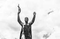 Memento park in Boedapest met communistische beelden, jongen met vlaggetje
