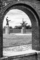Memento park in Boedapest met communistische beelden, doorkijkje op twee beelden