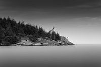 Ontdek de ongerepte schoonheid van Noorwegen met deze minimalistische zwartwit foto met houten huisjes en een houten ladder, gelegen aan de schilderachtige kustlijn. Deze unieke foto vangt de essentie van Noorse charme en brengt je in vervoering met zijn serene en natuurlijke pracht.