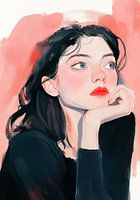 Portret van een vrouw in gedachten. Haar hoofd rust op haar hand. Mooie contrasterende kleuren in roze, zwart en rood. Heldere oogopslag met blauwe ogen. Starend en verzonken in herinneringen. Minimalistisch, eenvoudig en indrukwekkend. Grove penseelstreken in combinatie met fijne lijnen (Fine Art) maken het een boeiend geheel. Passend…