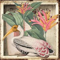 Een Trompe-l'oeil met botanische en tropische vintage afbeeldingen.