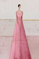 De zachte roze jurk contrasteert met het ruwe, gelaagde oppervlak en de verfijnde goudlijnen.