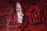 Memory is een surrealistische, abstracte collage poster en canvas print met een grungy touch in de kleur rood. Het is een mysterieus werk waarbij gebruik is gemaakt van diverse digitale kunst technieken. Het meisje kijkt naar iets in de verte. Waar denkt ze aan? Een gewaagde eyecatcher voor elk modern interieur.