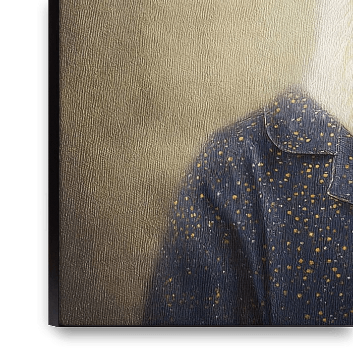 Stoer én stijlvol: deze elegante gans poseert alsof hij zo uit een aristocratisch sprookje is gestapt. Zijn donkerblauwe pyjama met goudkleurige details maakt haar een opvallende verschijning. Een mix van humor, verfijning en dierlijke charme, perfect voor iedereen die van unieke kunst aan de muur houdt.
