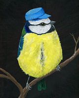 Een schilderij in acrylverf van een zeer schattig pimpelmeesje. Het vogeltje draagt een blauw petje. Als tegenhanger van het koolmeesje dat een zwarte stropdas draagt. Dit leerde ik als kind; Pimpelmeesjes hebben blauwe Petjes en koolmeesjes dragen zwarte stropdasjes, een soort ezelsbruggetje.