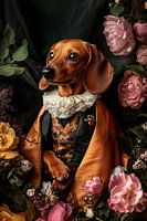 Portret van een teckel, in 18e eeuws kleding omringd door bloemen. Een grappig en klassiek portret.
